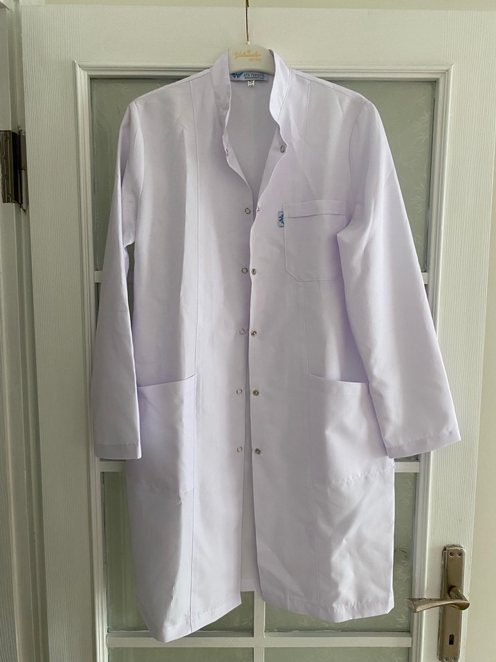 Düğmeli, notched lapel yakalı beyaz midi önlük Uzun kollu, sentetik kumaştan, günlük kullanıma uygun sade ve regular fit tasarım.