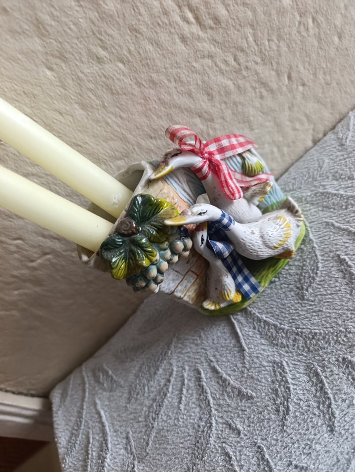 Renkli kurdeleler ve üzüm detaylarıyla süslenmiş beyaz ördek figürlü, iki mum tutan mumluk. ️