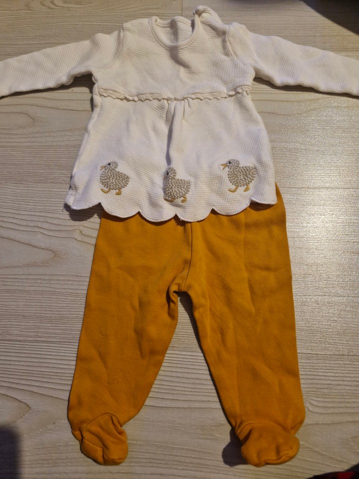 Beyaz uzun kollu üstü ördek desenli, turuncu patikli alt bebek kız takımı. 3-6 aylık kullanima uygun. tertemizdir.