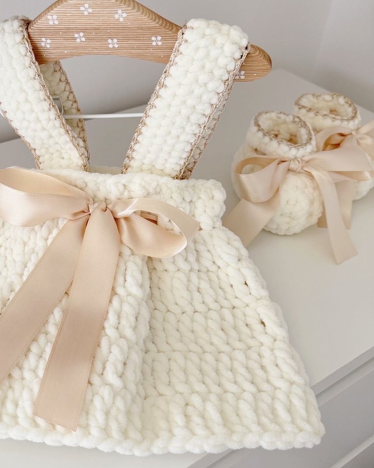 Beyaz örgü askılı elbise ve saten kurdeleli örgü patiklerden oluşan bebek kız seti. Yumuşak ve rahat dokuda, nakış detaylı. İstenilen renk ve ölçüye özel yapılır