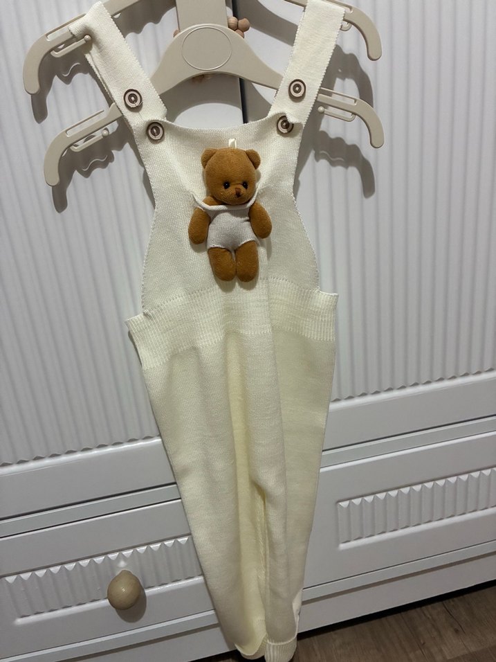 Beyaz, örgü kumaştan yapılmış askılı bebek tulumu. Önünde küçük bir oyuncak ayı detayı bulunur. Yumuşak ve hafif dokusu ile rahatlık sağlar. HİÇ KULLANILMADI