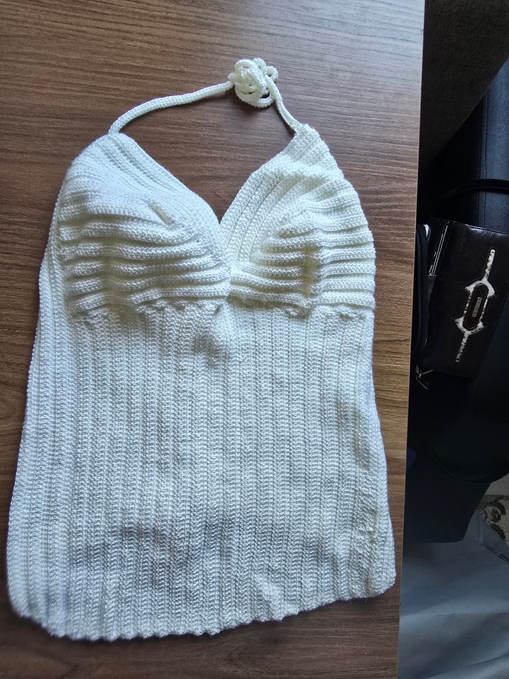 Beyaz örgü askılı kadın süveter, straplez yaka ve kolsuz tasarıma sahiptir. Normal boyda, sıkı oturan ve günlük kullanıma uygun sade bir modeldir.