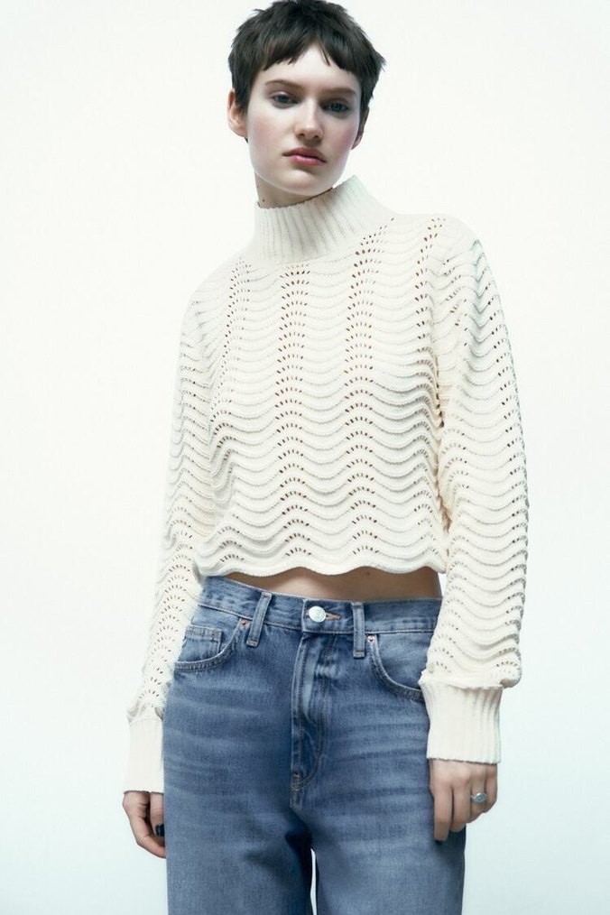 Beyaz örme kumaştan, balıkçı yaka ve uzun kollu, bol kesim kadın kazak. Desensiz ve normal boyda, günlük kullanıma uygundur.