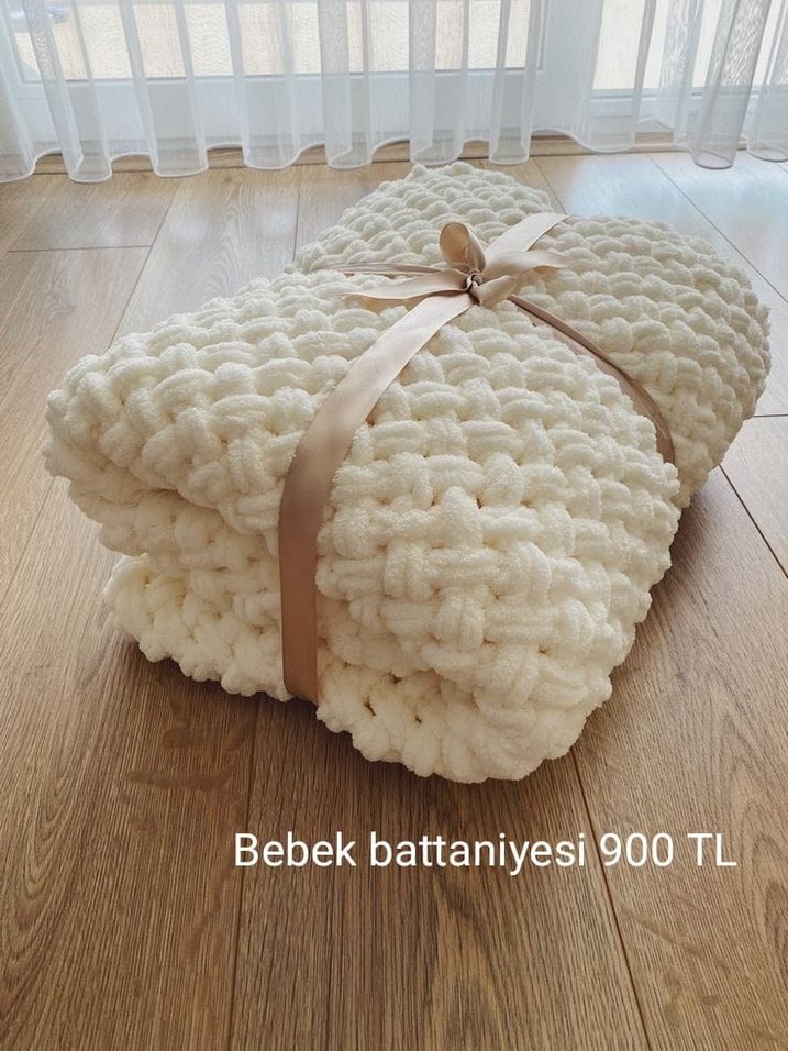 Yumuşak dokulu, beyaz el örgüsü bebek battaniyesi, Bebekleri sıcak tutmak için ideal.