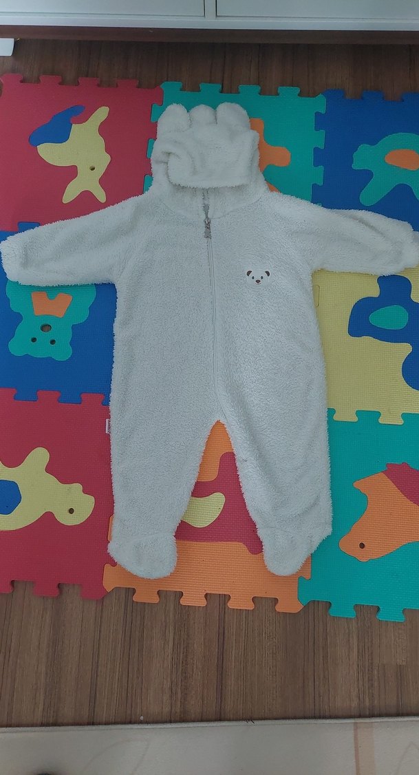 Yumuşak ve sıcak kumaştan, önden fermuarlı beyaz örgü bebek kar tulumu. Kapüşonunda kulaklar ve göğsünde küçük ayı yüzü detayı bulunur.