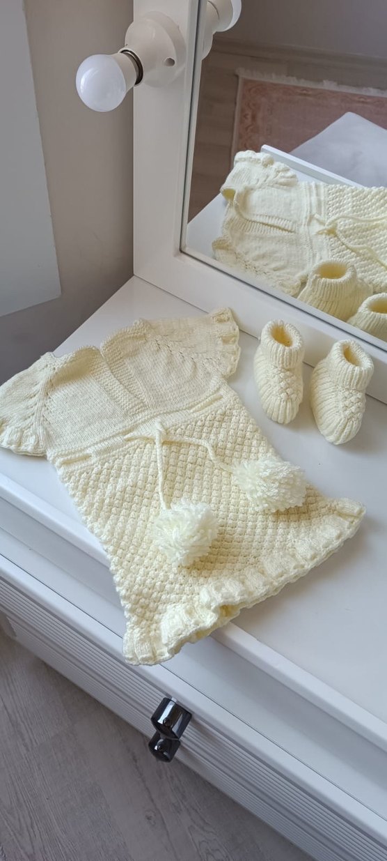 Beyaz örgü bebek kız elbise seti, askılı patiklerden oluşur.