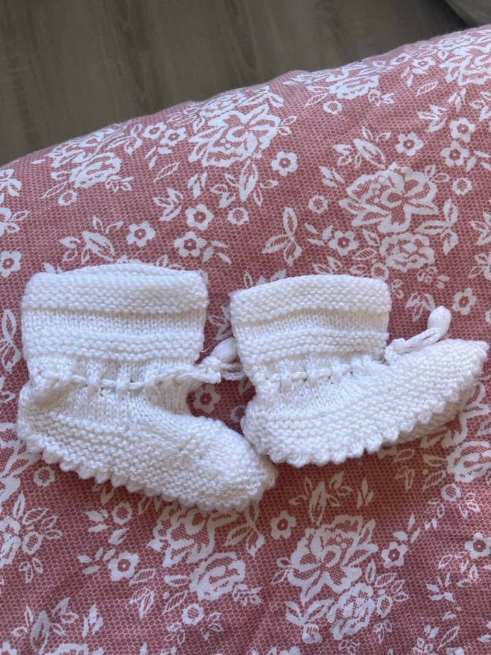 Yumuşak örme kumaştan yapılmış, işlemeli detaylı beyaz bebek patikleri. Geleneksel tarzda, sade ve temel görünüme sahip.