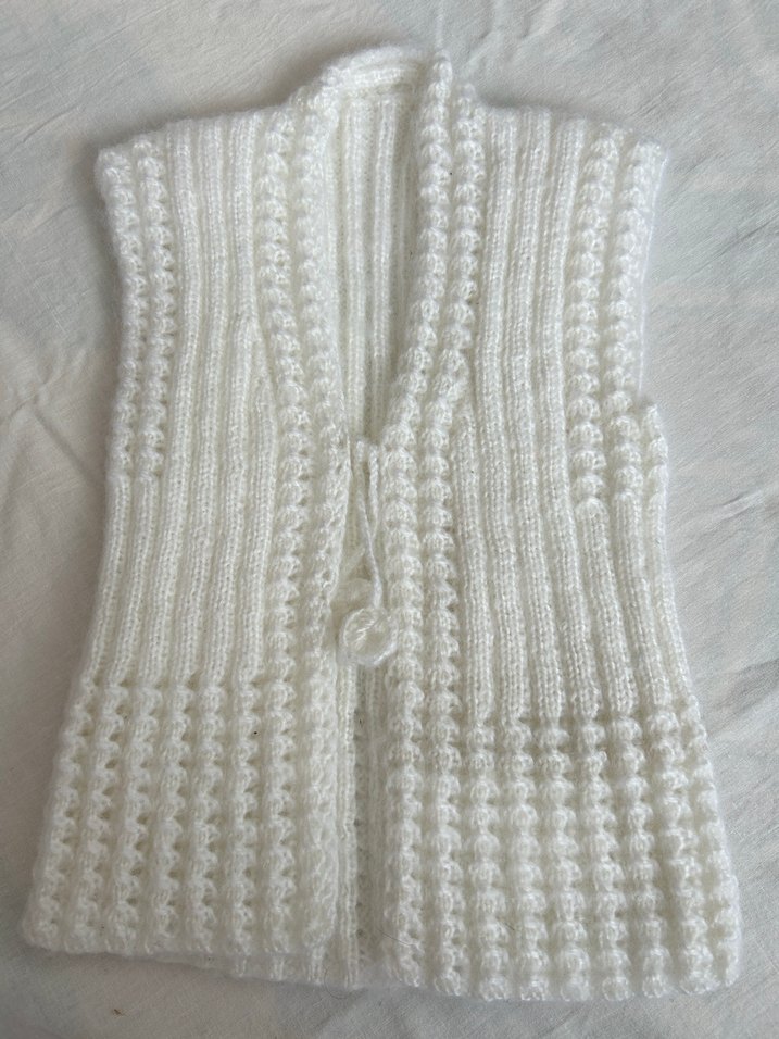Beyaz renkli, örgü dokulu, kolsuz bebek süveter. V yaka ve fitted kesimle günlük kullanıma uygun sade, bohem tarzda.
