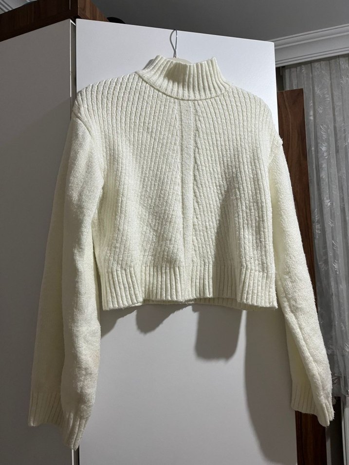 Beyaz renkli, örgü kumaştan yapılmış, boğazlı ve uzun kollu, normal boyda, vücuda oturan kadın kazak. Rahat ve günlük kullanıma uygun, trend sokak stiline uyum sağlar.