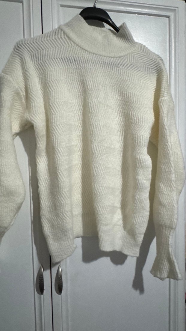 Beyaz renkli, örgü dokulu boğazlı ve uzun kollu kadın kazak. Rahat kesimdir. S beden ve hiçbir deformesi yok. Markası trendyolmilladır.