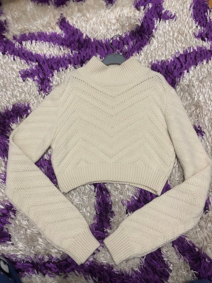 Beyaz renkli, örgü dokulu, boğazlı ve uzun kollu, fitted kesim kadın kazak. Günlük kullanıma uygun rahat ve şık bir parça. Crop şeklinde duruyor. Kalın, sıcak tutuyor. Hiç kullanılmadı.