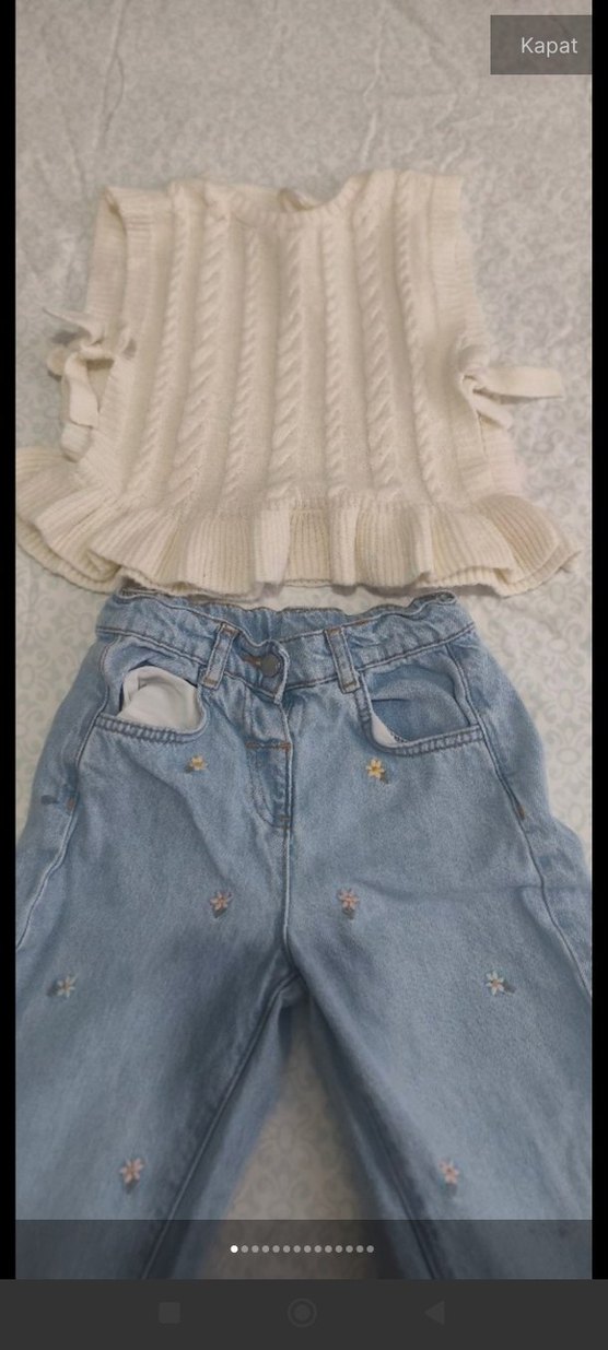 Beyaz renkli, örgü dokuda, boğazlı ve askılı kollu, nakış detaylı bol kesim kız kazak.