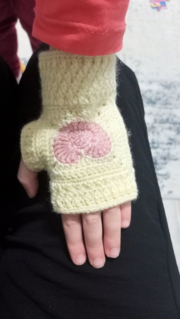 Beyaz örgü bohem tarzda, pastel pembe kalp detaylı parmakları açık çocuk eldiveni. Sıcak ve rahat kullanım sağlar.