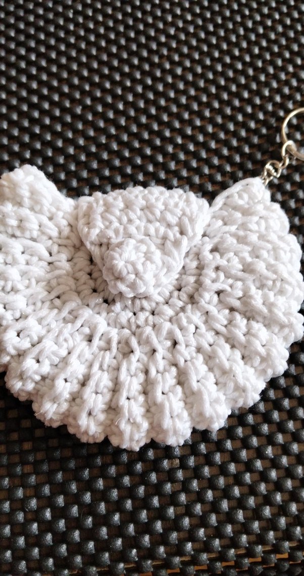 Beyaz örgüden yapılmış, rahat ve bohem tarzda, retro havası olan anahtarlık.