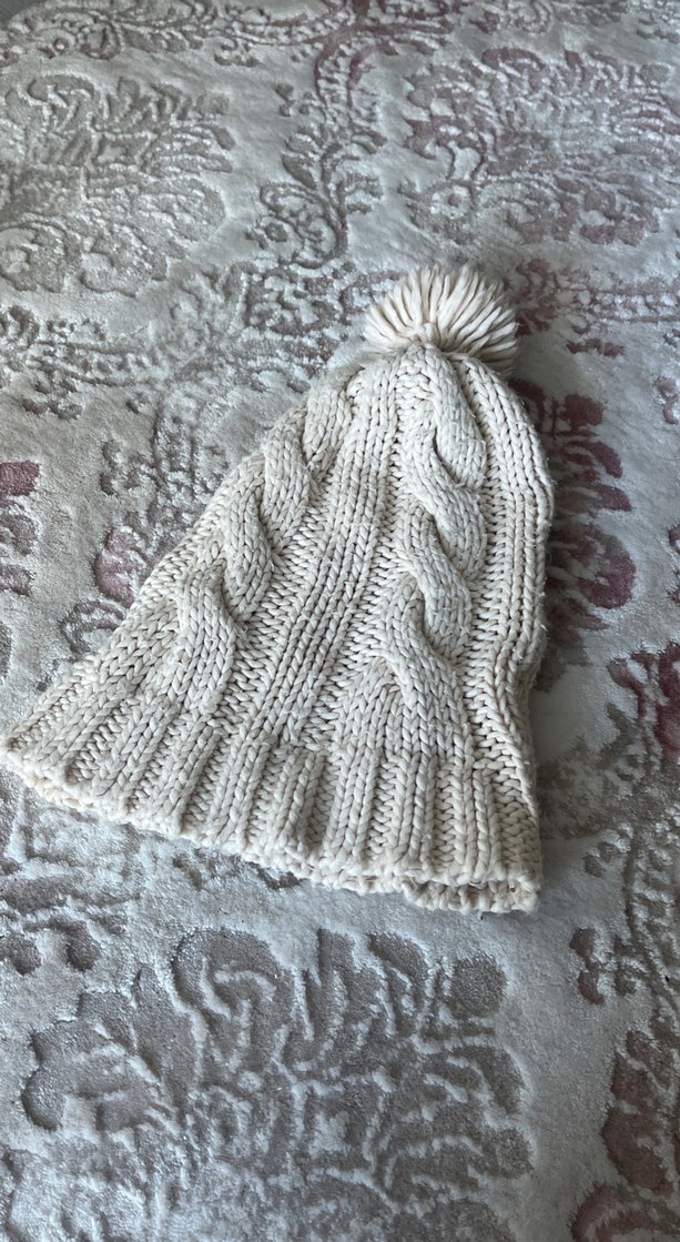 Beyaz örgüden yapılmış, üzerinde ponpon bulunan bohem tarzda kadın bere. Yumuşak ve rahat dokusu soğuk havalar için uygundur. ❄️