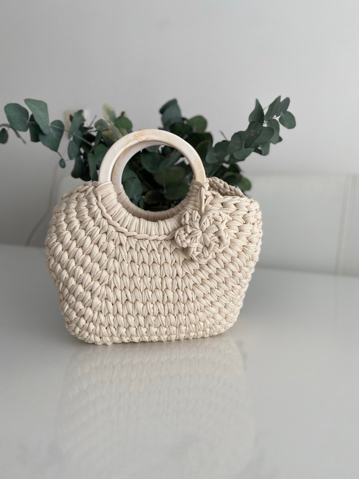 Yuvarlak ahşap saplı ve çiçek detaylı beyaz örgü kadın çantası, minimalist bohem stil için uygundur.
