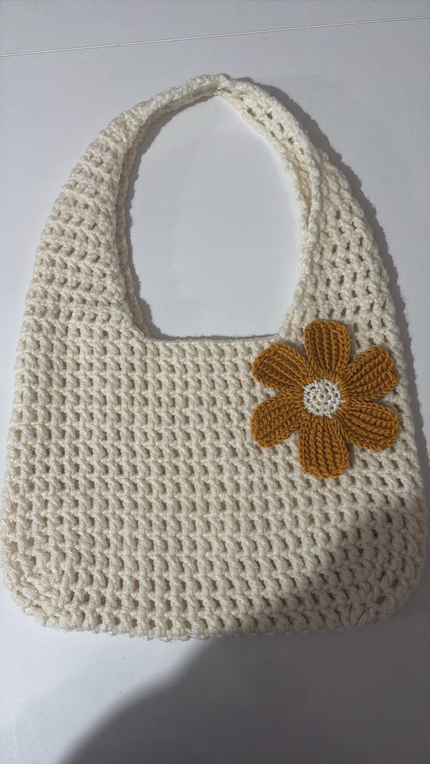 Beyaz örme kadın çanta, pastel renkli nakışlı çiçek detayıyla bohem ve minimalist tarzı bir araya getirir.