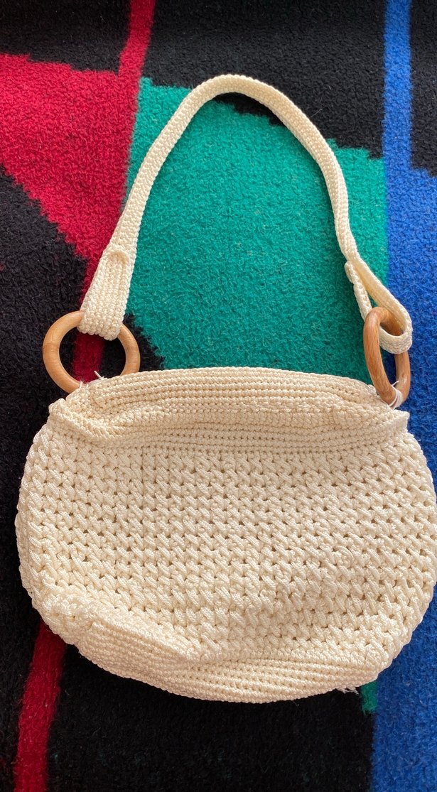 Ahşap halka saplı, yumuşak örgü dokulu beyaz bohem kadın çantası, günlük kullanım için uygundur.