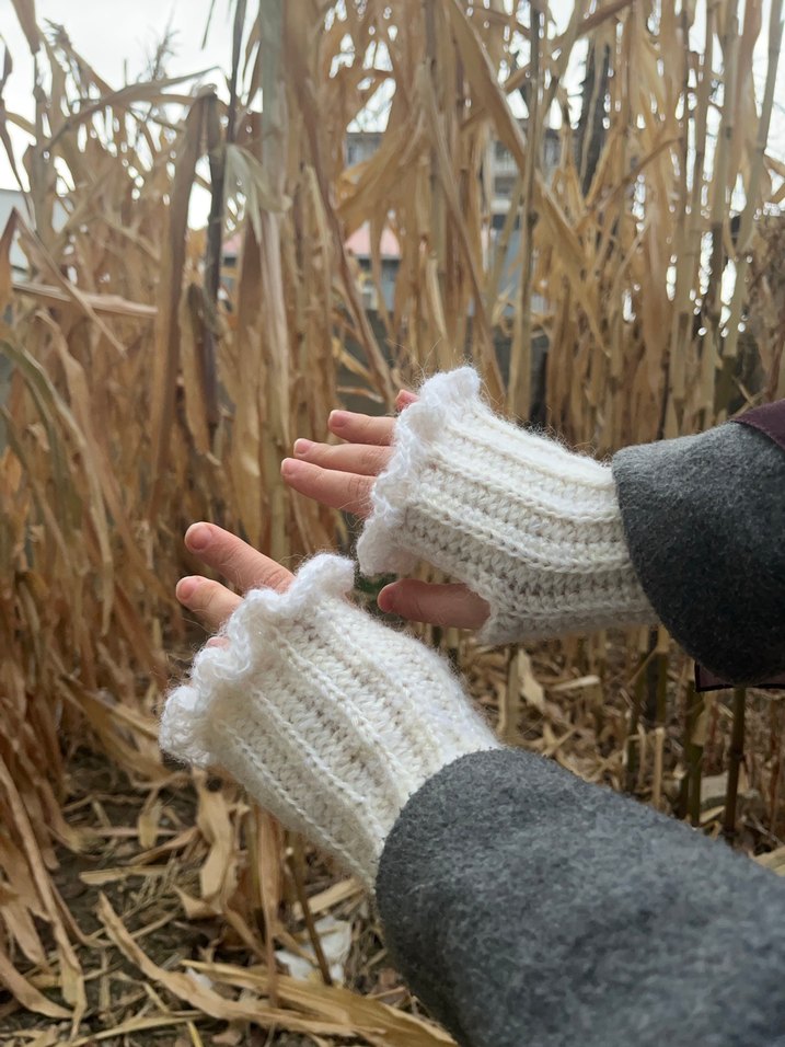 Beyaz örgü kumaştan yapılmış, bohem tarzı ve retro havası olan kadın eldivenleri. Yumuşak dokusu ve fırfırlı kenarlarıyla sıcak tutar ve şık görünür.