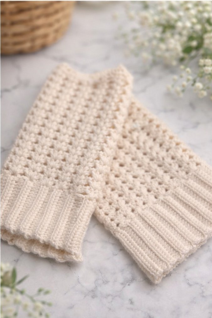 Beyaz renkli, yumuşak örgü kumaştan yapılmış, bohem tarzda, sade ve temel görünümlü kadın eldivenleri. İstenilen ölçüde istenilen renkte yapılır.