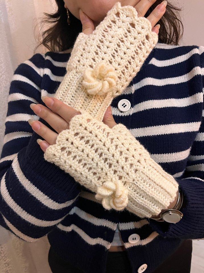 Beyaz örgü, bohem tarzda kadın eldiveni. Rahat dokusu ve çiçek detayları ile retro ve hippie görünüme uyum sağlar.