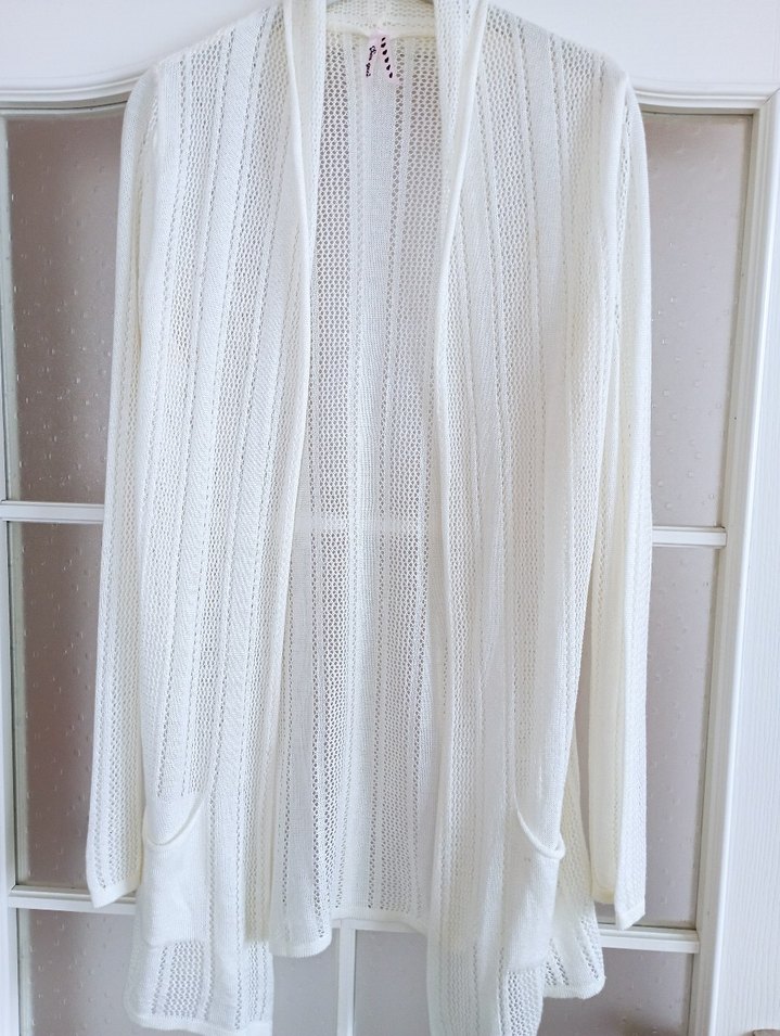 Beyaz örgü bohem kadın hırka, V yaka, uzun kollu, gevşek kesim rahat ve şık bir görünüm sunar. defo vs yok temiz üründür.omuz 38 cm,boy 84 cm
