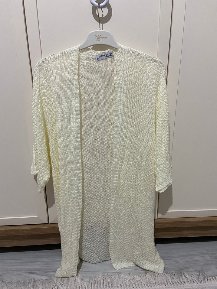 Beyaz örgü, uzun kollu, salaş kesim bohem kadın hırka. Midi boy ve rahat, desen içermeyen tasarıma sahiptir. Günlük kullanım için uygundur.