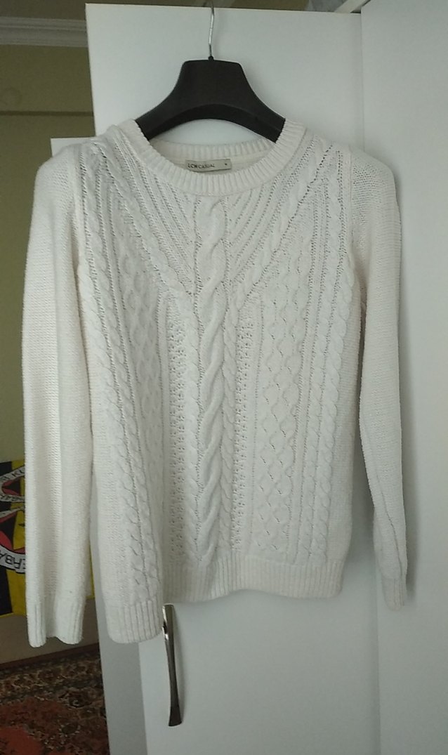 Beyaz renkli, örgü kumaştan bohem tarzda, yuvarlak yakalı ve uzun kollu, rahat kesim kadın kazak.