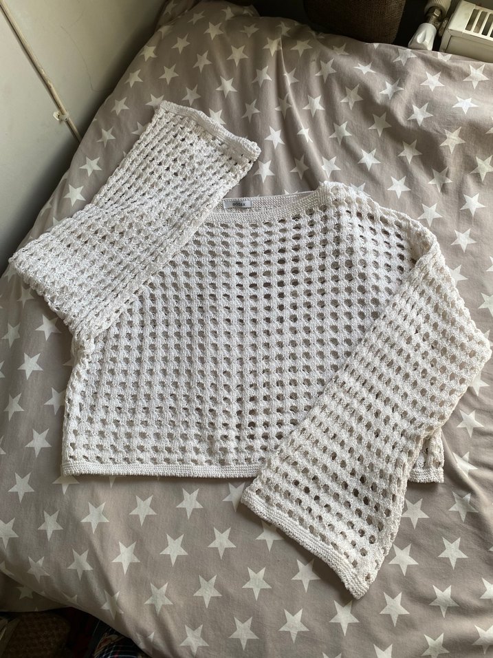 Uzun kollu, beyaz örgü bohem tarzda, salaş kesim ve tek renk kadın kazak. Nefes alan açık örgü dokusu günlük kullanım için uygundur.