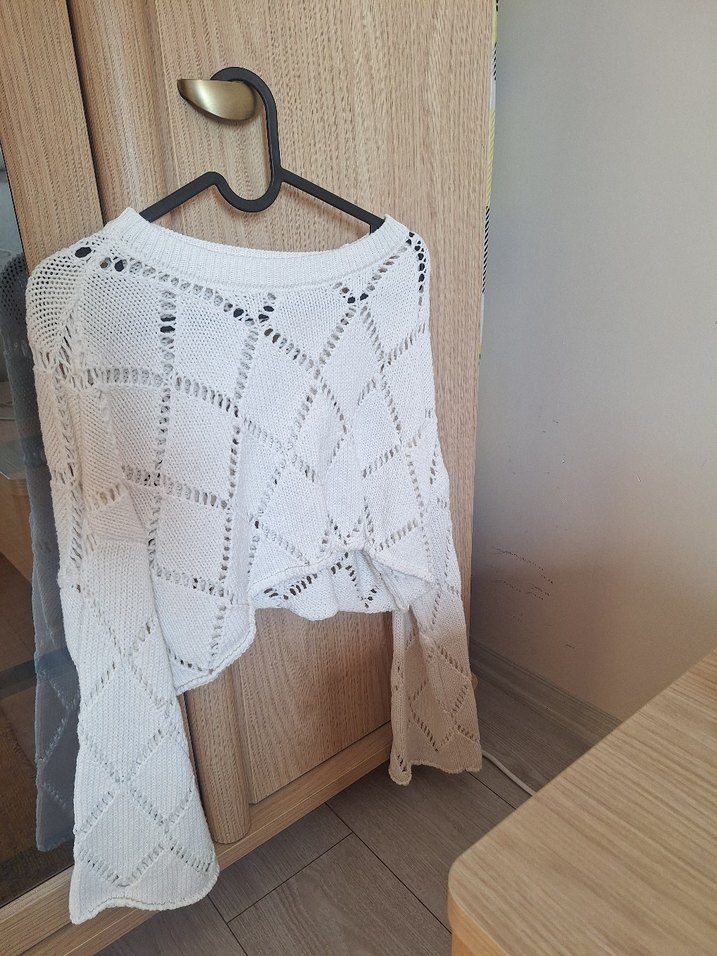Beyaz renkli, gevşek kesim, yuvarlak yaka ve uzun kollu örgü bohem kadın kazak. Kısa boyu ile günlük kullanıma uygundur. s-m uyumlu