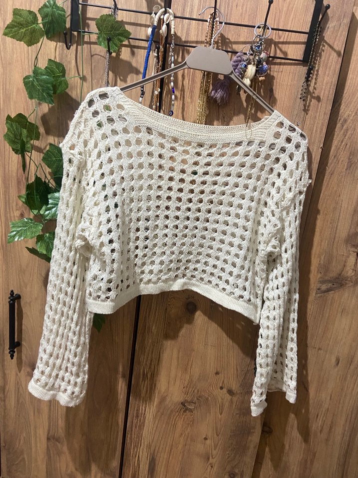 Beyaz örgü, bol kesim, uzun kollu ve yuvarlak yakalı bohem tarzda kadın kazak. Örgü deseniyle rahat ve şık bir dış mekan görünümü sunar.