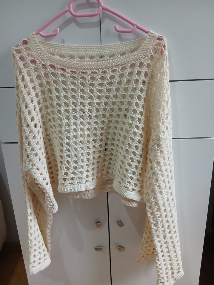 Bu beyaz örgü kadın kazak, bol kesimi, uzun kollu ve tekne yaka detayına sahiptir. Açık örgü deseniyle rahat ve bohem bir tarz sunar.