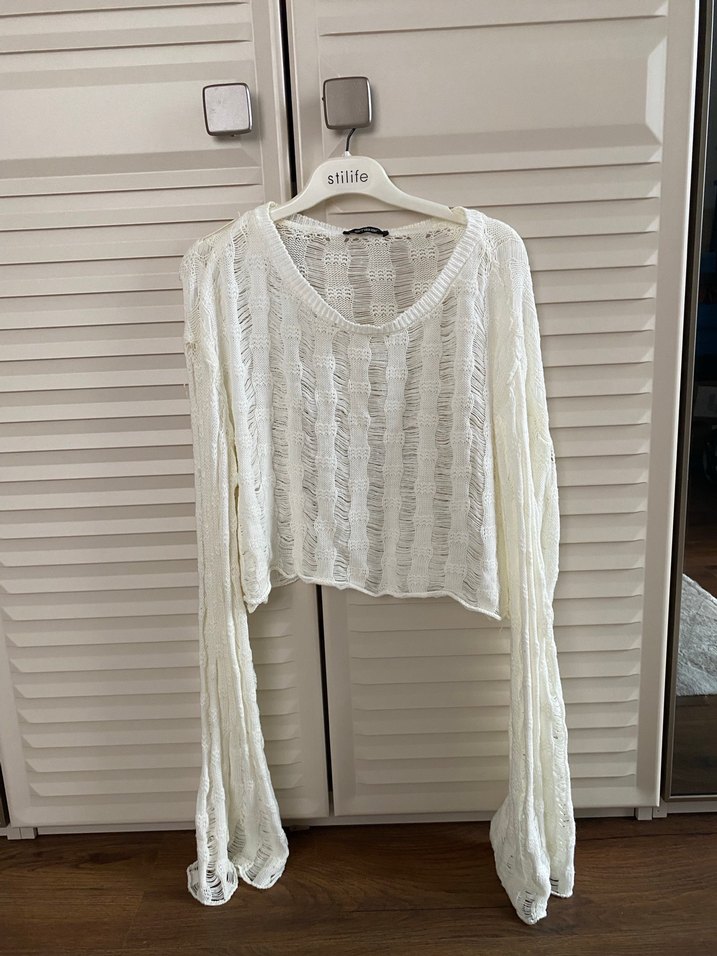 Beyaz örgü kumaştan, uzun kollu ve kayık yaka, bol kesim bohem tarzda kadın kazak. Hafif ve desensiz, günlük kullanım için uygun. OCR: "tilit"