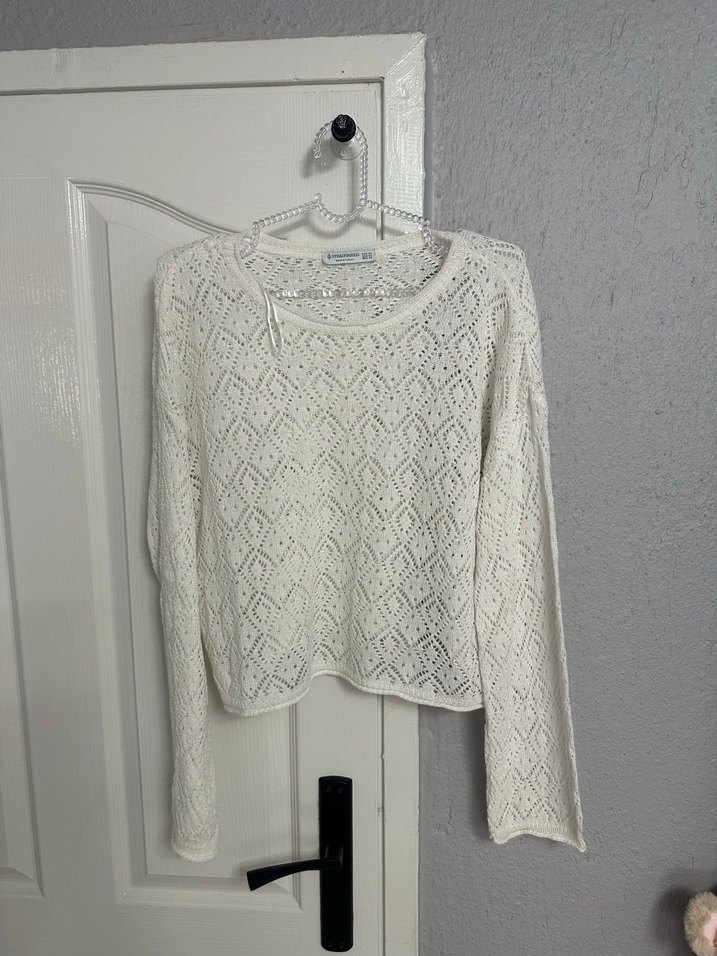 Beyaz örgü, yuvarlak yaka ve uzun kollu, bol kesim kadın kazak. Örgü deseniyle bohem ve rahat bir görünüm sunar.