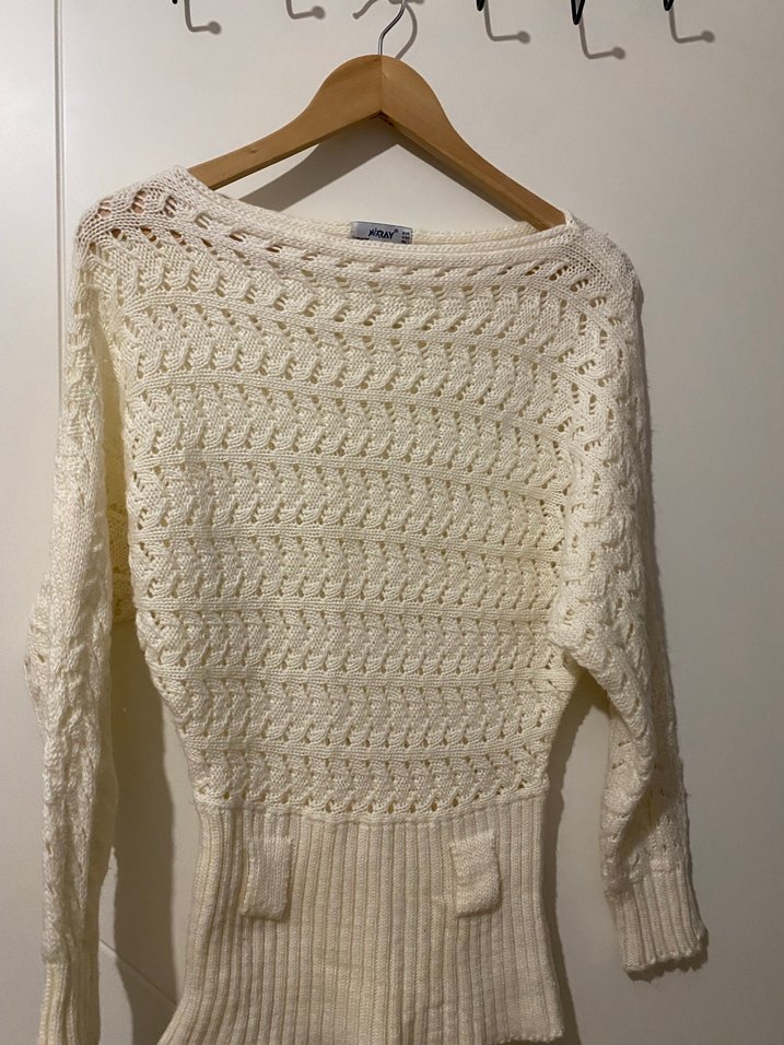Beyaz örgü kumaştan, tek renk ve bohem tarzda, uzun kollu ve kayık yaka kadın kazak. Rahat ve salaş kesimle günlük kullanıma uygun. Krem renkli, örme dokulu kazak. Günlük kullanım için idealdir. En 55 boy 70 marka temsilidir
