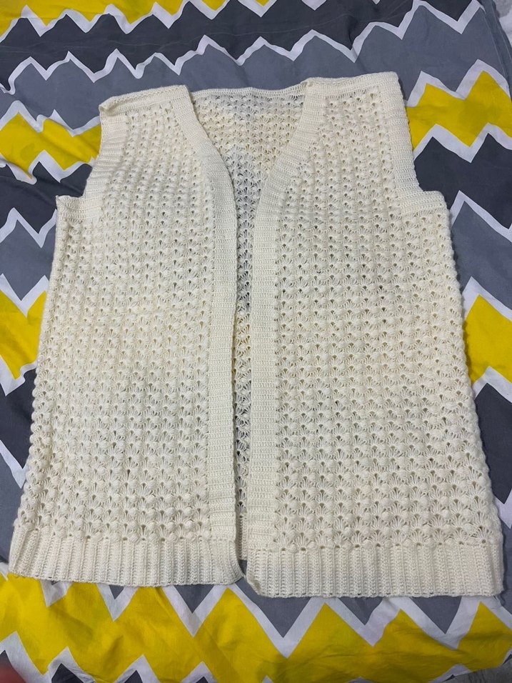 Beyaz örgü kadın yelek, V yaka ve kolsuz, rahat kesimlidir. Bohem tarzıyla günlük kullanıma uygundur. El örgüsü el emeğidir çeyizlik