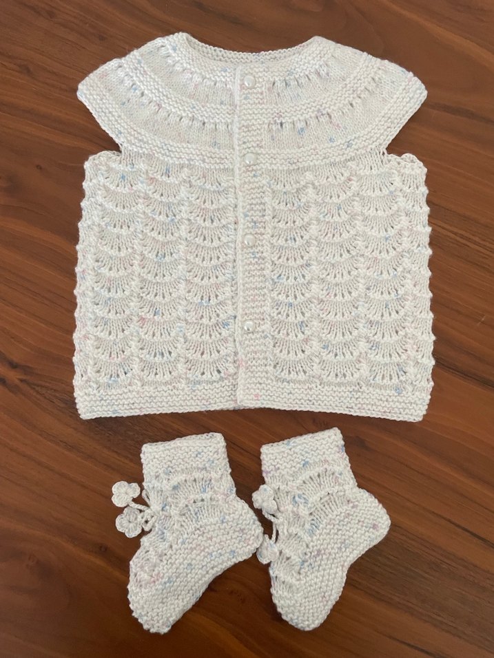 Beyaz örgü, kolsuz, bol kesim ve bohem tarzda bebek yeleği, uyumlu patik ile birlikte. Yumuşak ve rahat bir kullanım sunar.