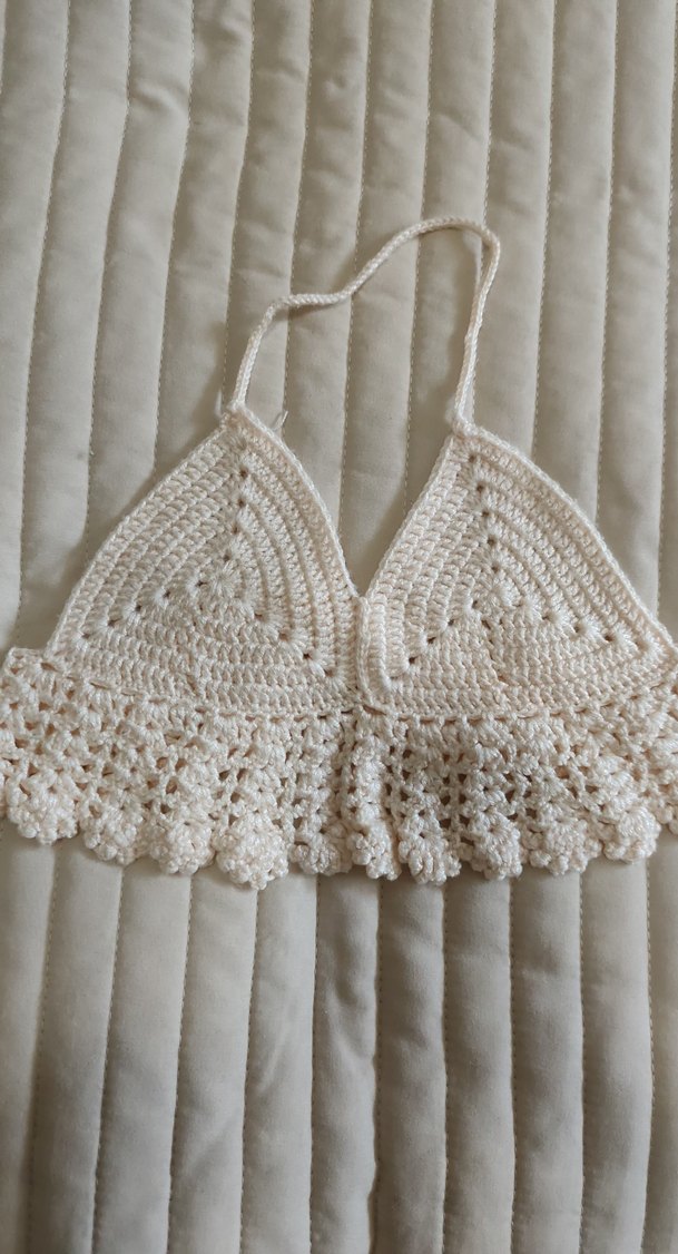 Beyaz örgü mini büstiyer, bohem tarzda, ince askılı ve fırfırlı etek ucu ile hafif ve şık bir görünüm sunar.