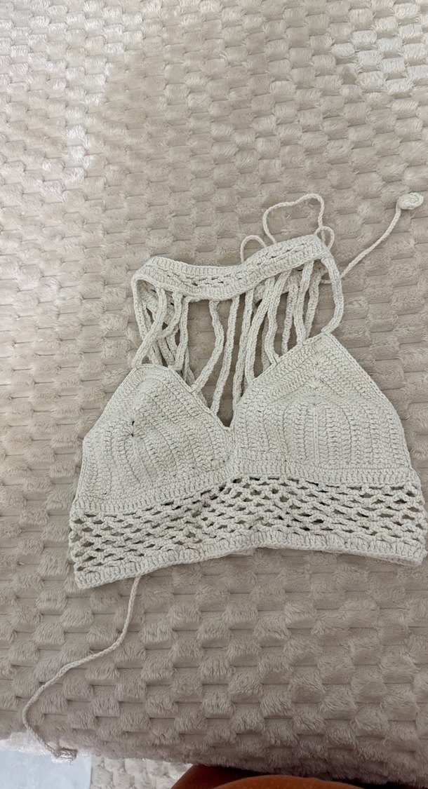 Beyaz örgü mini büstiyer, halter yaka ve ince askılarla bohem tarzı yansıtıyor. Kısa ve desen içermeyen modeli retro, hippie havası katıyor.