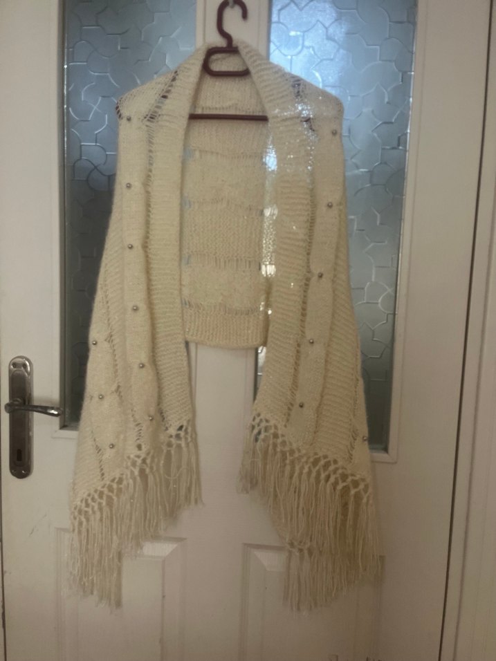 Beyaz örgü kadın şal, püskül detayları ve bohem tarzıyla rahat ve yumuşak dokulu, retro ve hippie görünüm için uygundur. Özel gelinlik için örüldü. Simli . Sadece düğünümde kullandım sıcak tutar Kirik beyaz yada krem renk