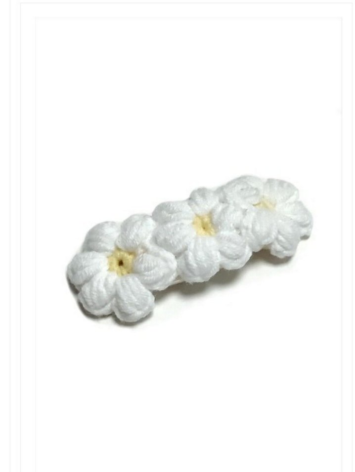Beyaz örgü çiçeklerle süslenmiş, sade bohem tarzda çocuk saç tokası.