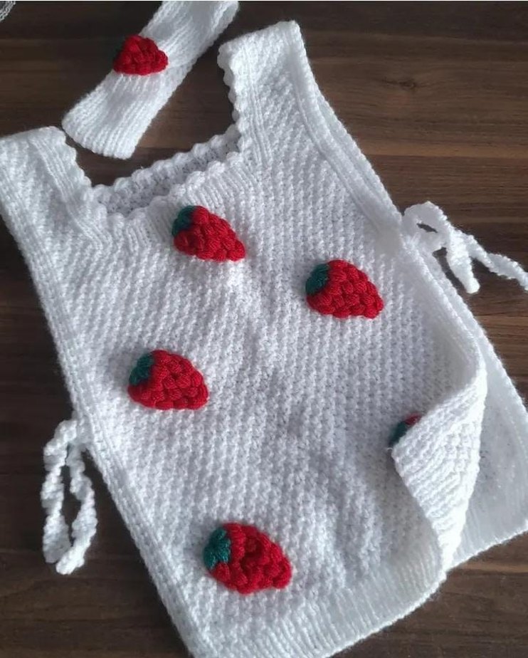 Renkli çilek beyaz örme, kolsuz ve bol kesim bohem tarzda kız yeleği. bandana ile takimdir