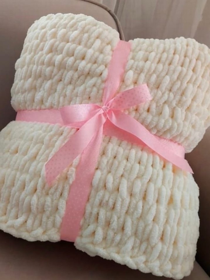 Pastel beyaz renkli, yumuşak örgü çocuk battaniyesi, pembe kurdele ile bağlanmış. Rahat ve nazik bir dokunuş sağlar.