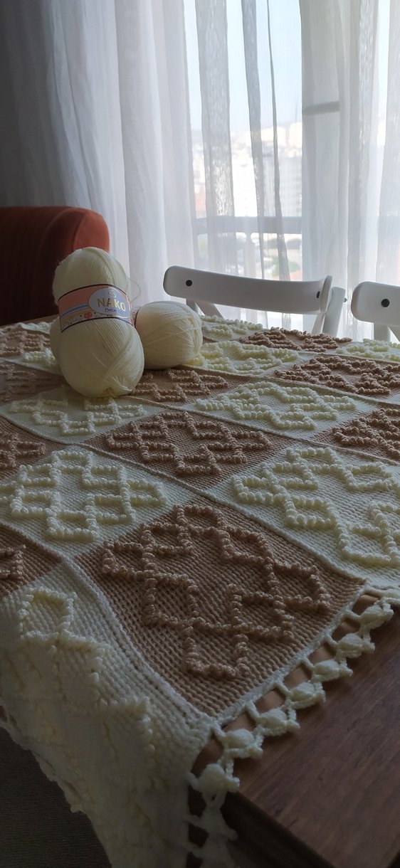 Hafif beyaz renkli örgü çocuk battaniyesi, yumuşak dokusu ve püsküllü kenarlarıyla rahatlık sağlar.