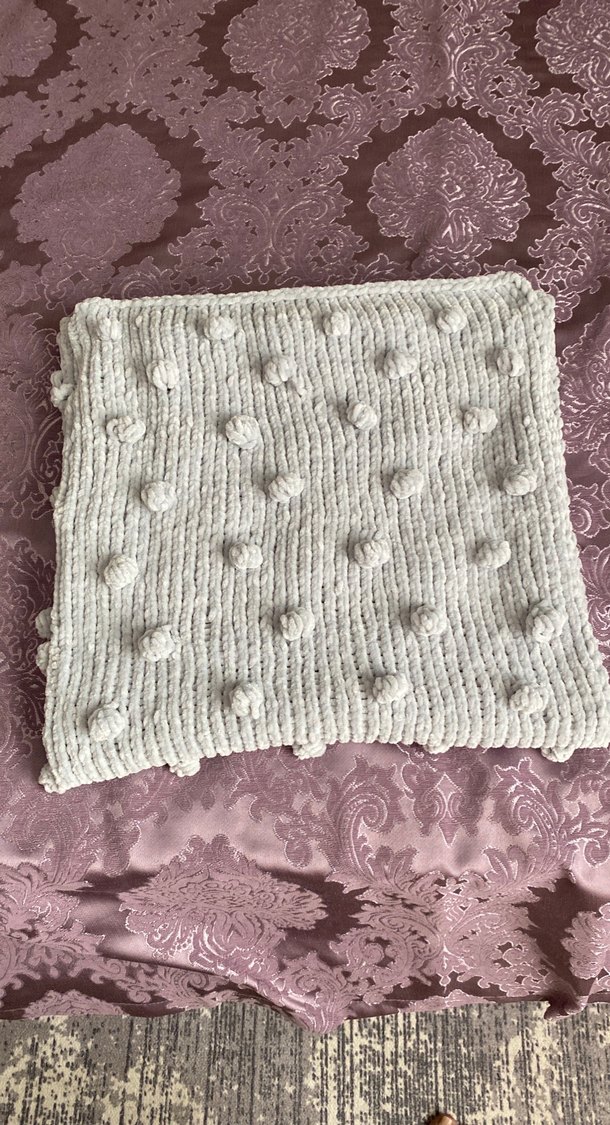 Beyaz örgü çocuk battaniyesi, kabartmalı noktalarla dokulu ve yumuşak bir yapıya sahiptir. Kadife iple yapıldı 100*100cm boyutunda istenilen renk ve ebatta yapılır
