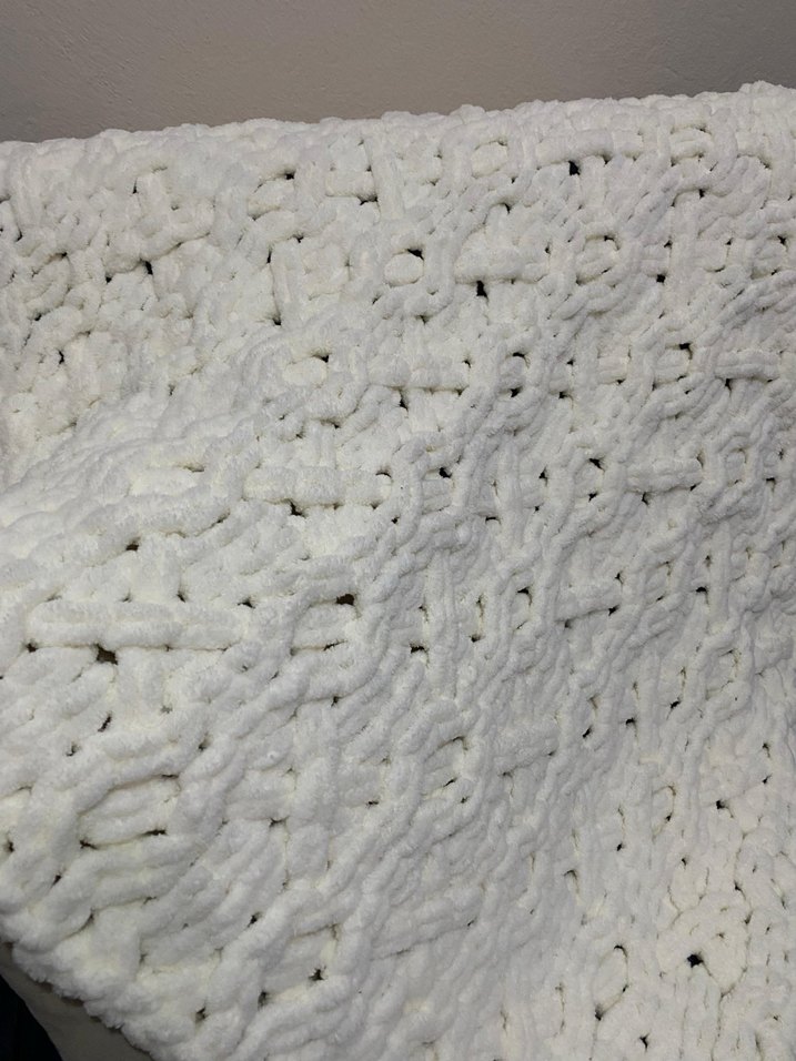 Beyaz örgü çocuk battaniyesi, yumuşak ve rahat dokusuyla çocukları sıcak tutar.