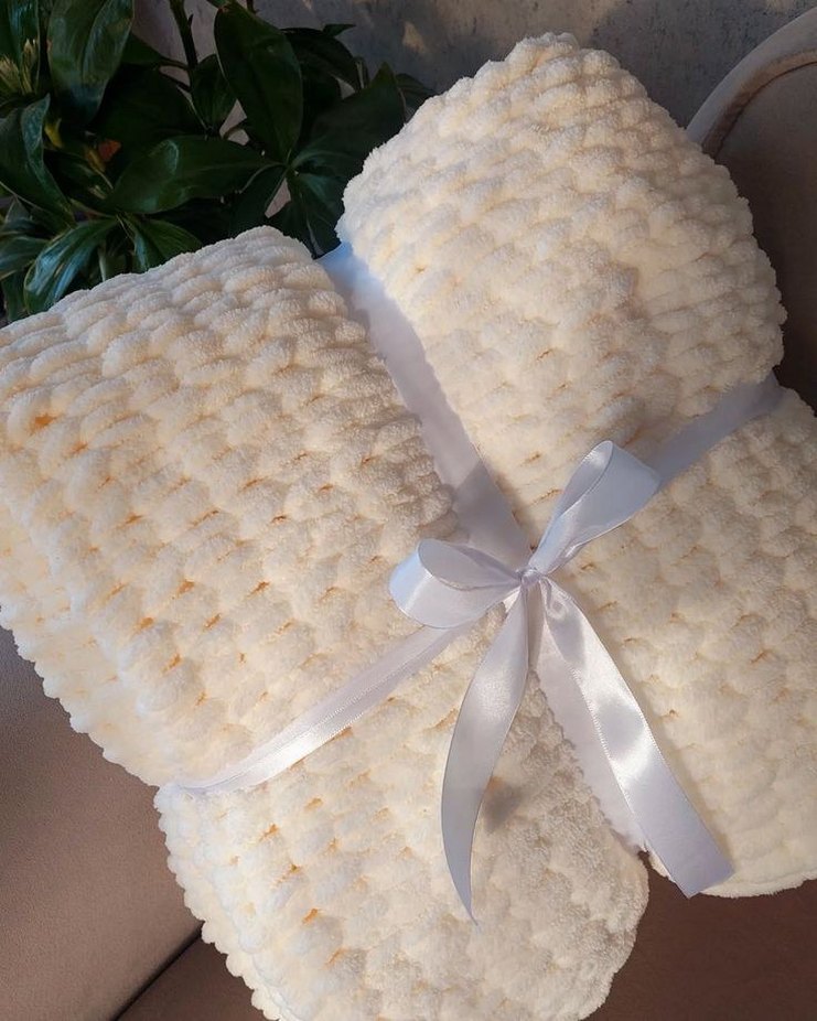 Yumuşak örgü dokusuyla beyaz çocuk battaniyesi.Rahat ve nazik.İstenilen renkte yapılır. 90/90 ölçüsü vardır. istenilen ölçüye göre fiyat değişir