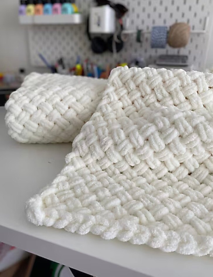 Beyaz, desensiz örgü çocuk battaniyesi. Hafif renk ve yumuşak dokuya sahip.