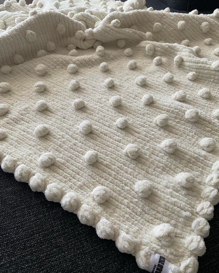 Yumuşak örgüden yapılmış beyaz çocuk battaniyesi, kabartmalı ponpon detaylarıyla dokulu ve rahat.