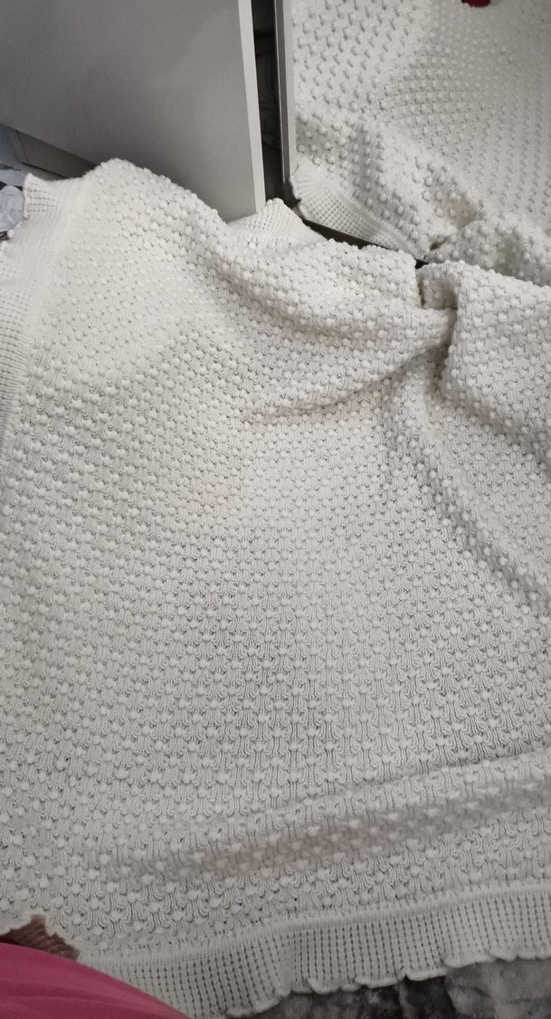 Yumuşak örgüden yapılmış, desensiz beyaz çocuk battaniyesi, rahat ve sıcak tutar.